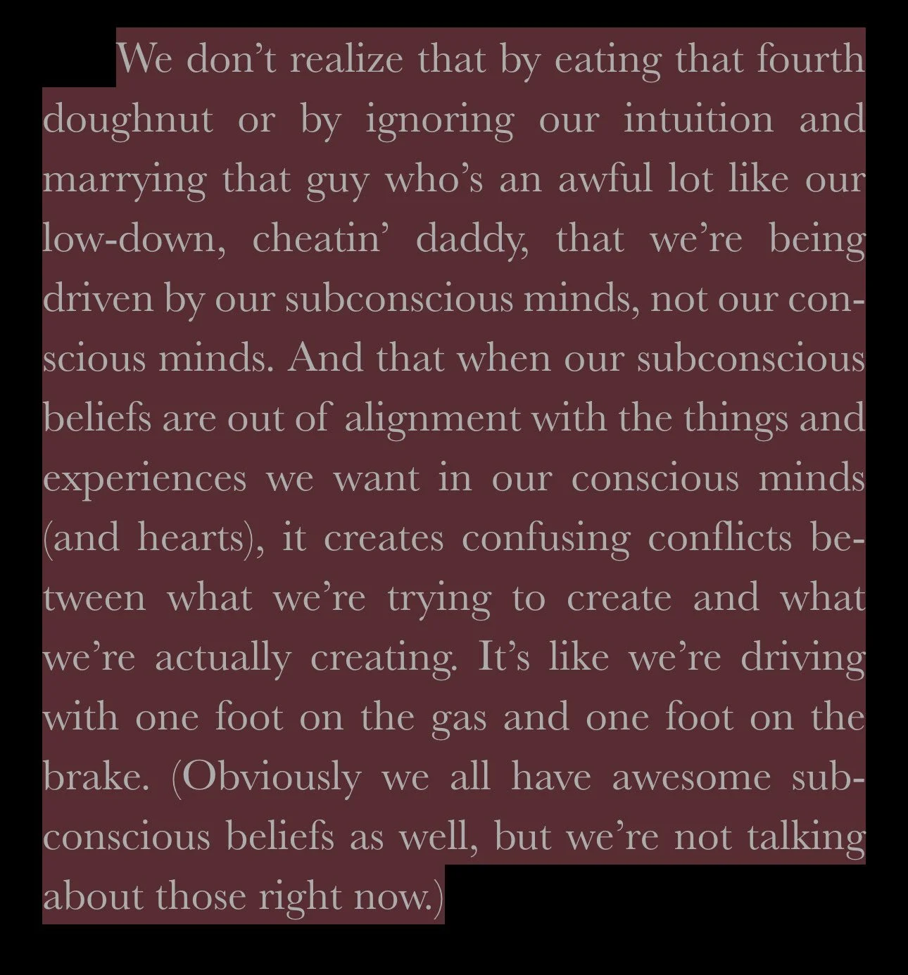 Sincero’s writing style is completely unapologetic and refreshing. To anyone who is familiar with the world of self-help books, sometimes the best thing you can do to help yourself is put the book down. With this one, though, this is not the case. Sincero does a great job of saying without saying “I’m not like other writers.” With a perfect mix of tough love, absolute realness and a heap of humor, cutting through the average self-help fluff, this book is refreshing, relatable and impactful.